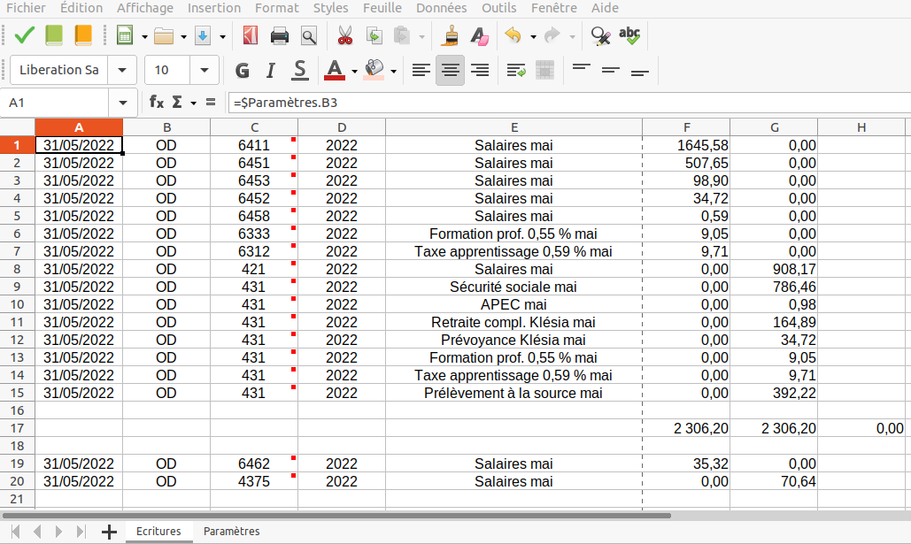A noter que l'on peut saisir les valeurs ou bien des formules qui découle du salaire brut par exemple. C'est ce que j'ai fait pour la taxe d'apprentissage, elle est automatiquement calculé à partir du brut, pas besoin de la ressaisir.
