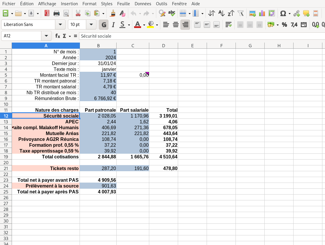 A noter que l'on peut saisir les valeurs ou bien des formules qui découle du salaire brut par exemple. C'est ce que j'ai fait pour la taxe d'apprentissage, elle est automatiquement calculé à partir du brut, pas besoin de la ressaisir.